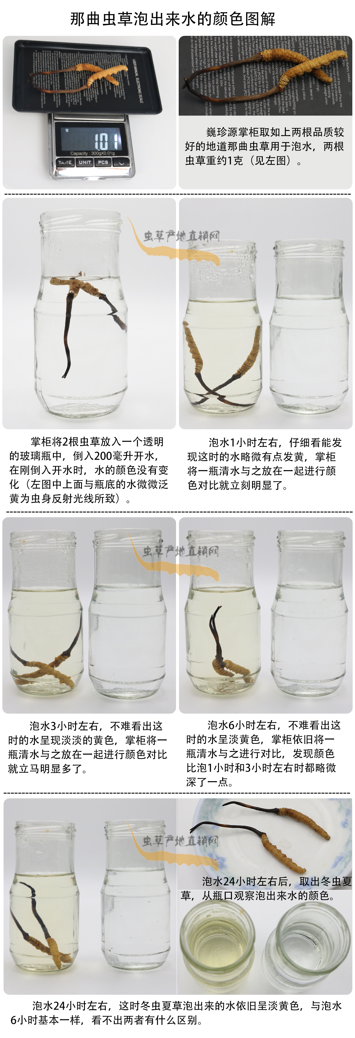 冬蟲夏草泡水是最常用的服用方法,有些細(xì)心的顧客在冬蟲夏草泡水過程中觀察水的顏色變化,并向我們提出了一些疑問。為了掌握第一手資料,更客觀準(zhǔn)確的回答大家的疑問,巍珍源掌柜親自試驗(yàn)冬蟲夏草泡水過程(以那曲冬蟲夏草作為試驗(yàn)樣本),并拍下水的顏色變化照片,請大家先看照片,然后巍珍源掌柜再就幾個重要問題進(jìn)行解答,照片如下: